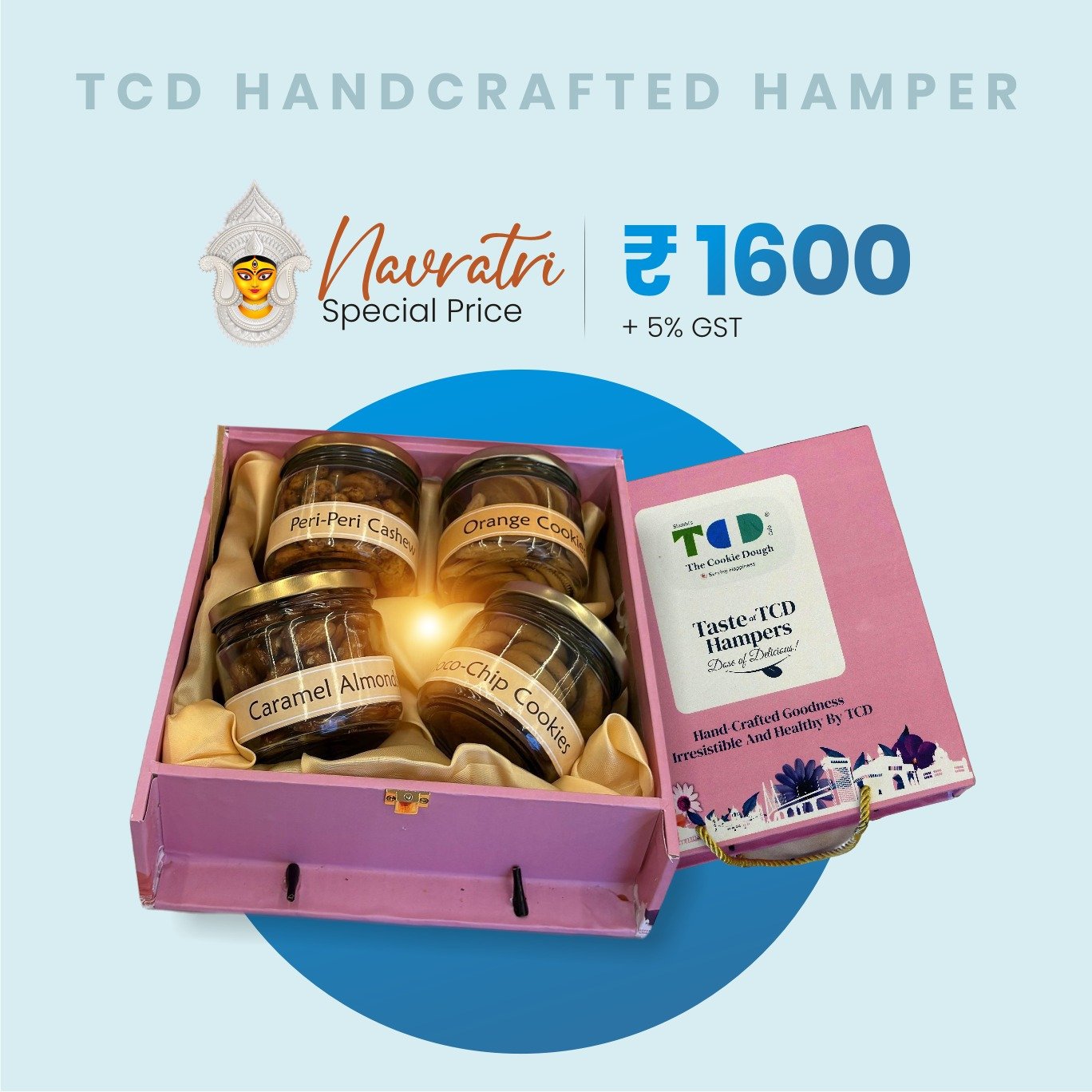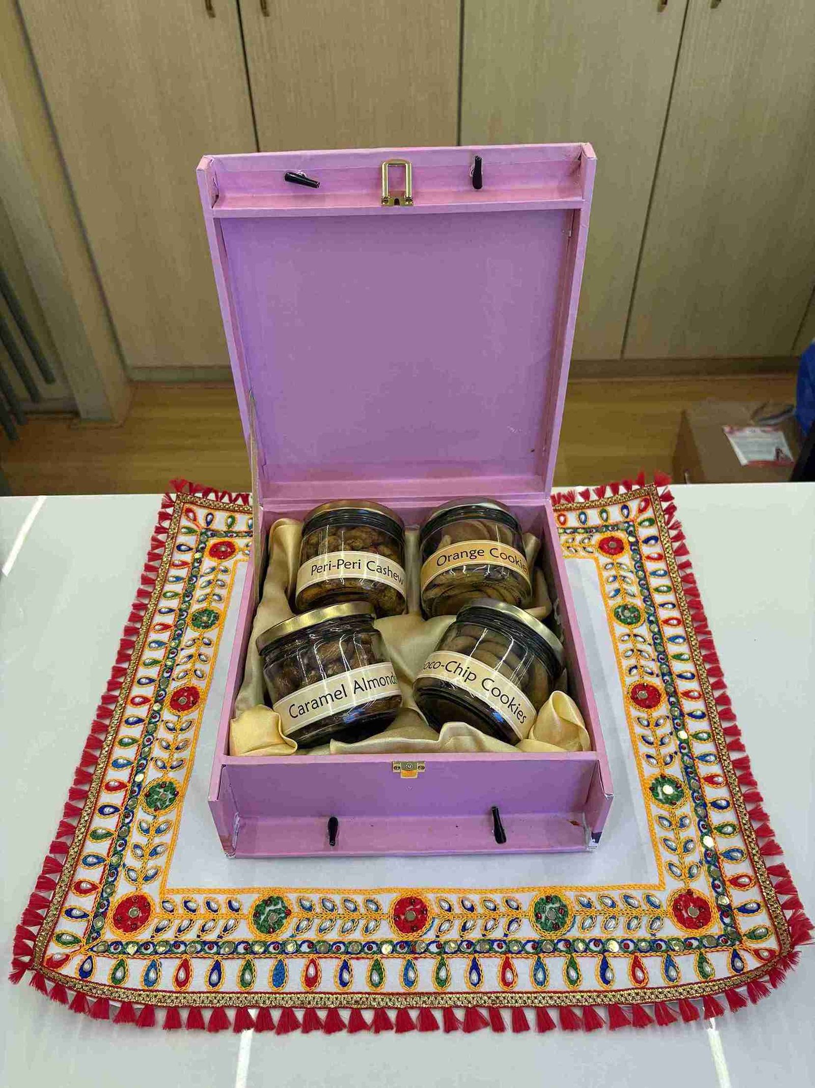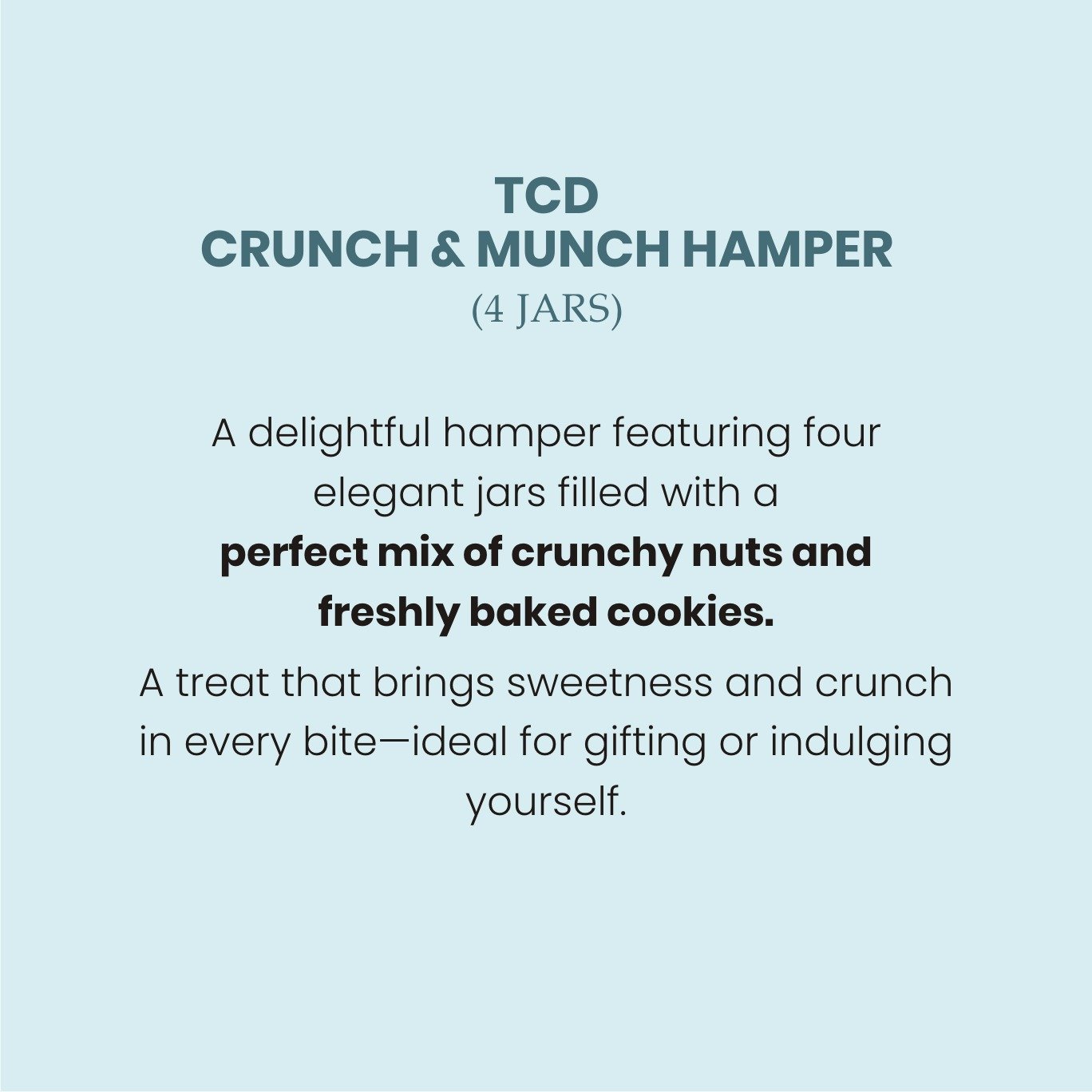 A delightful hamper featuring four elegant jars filled with a perfect mix of crunchy nuts and freshly baked cookies. A treat that brings sweetness and crunch in every bite—ideal for gifting or indulging yourself.